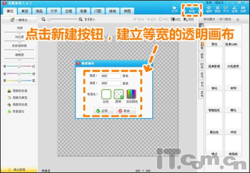 4.如果要做透明水印,就要用到透明的PNG格式,那接下來(lái)我們來(lái)做第二個(gè)圓形PNG格式的圖章,同樣點(diǎn)擊新建菜單,不過(guò)這回要新建一個(gè)等寬的透明畫(huà)布。