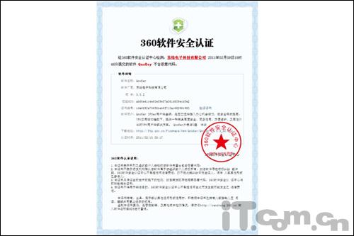 圖:QnoKey 軟件360安全認證證書(shū)