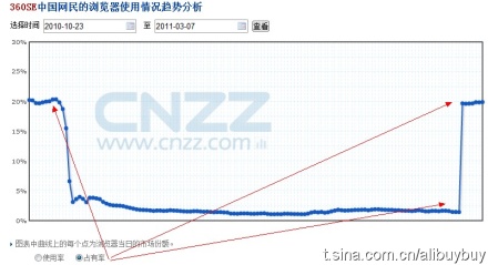 自從3Q大戰以來(lái),360瀏覽器就一直使用IE的識別標志,使得外界無(wú)法獲知360瀏覽器的實(shí)際份額。CNZZ自3月開(kāi)始對360瀏覽器進(jìn)行了重新統計,360瀏覽器占有量3月1號后出現異常波動(dòng),直線(xiàn)上升(見(jiàn)下圖)。2010年10月31號占有量為20.8%,11月2號后開(kāi)始直線(xiàn)下跌,到11月5日跌倒3%,而后占有量一路都在在2%以下。突然從3月1號直線(xiàn)上升,幾乎一夜恢復到了去年3Q大戰前的水平。目前360瀏覽器的占有率已經(jīng)恢復戰前水平,但已經(jīng)低于IE8,名列第三。