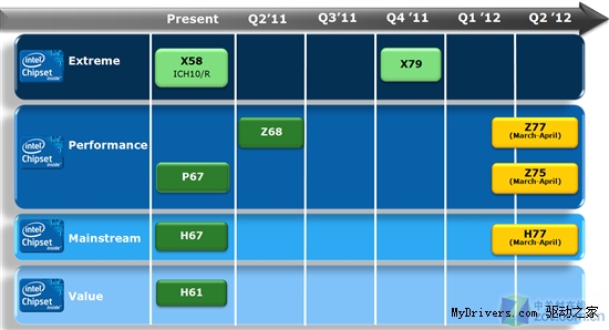 另一張芯片組路線(xiàn)圖也證明了新平臺的延遲。Z77、Z75、H77等三款與Ivy Bridge處理器配套的芯片組也都安排在3-4月份,分別取代Z68、P67、H67,但是入門(mén)級領(lǐng)域暫時(shí)繼續交給H61。