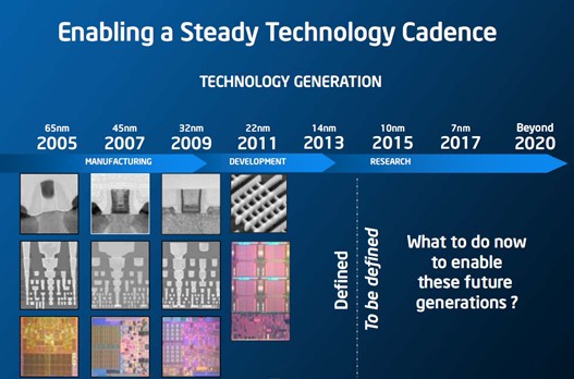按照這份路線(xiàn)圖,Intel的半導體工藝將繼續嚴格執行Tick-Tock策略,每?jì)赡晟壱淮?。目前正在開(kāi)發(fā)的是22nm工藝,預計下半年量產(chǎn)、明年上半年發(fā)布。接下來(lái),2013年就會(huì )轉入14nm,2015年繼續進(jìn)步到10nm。