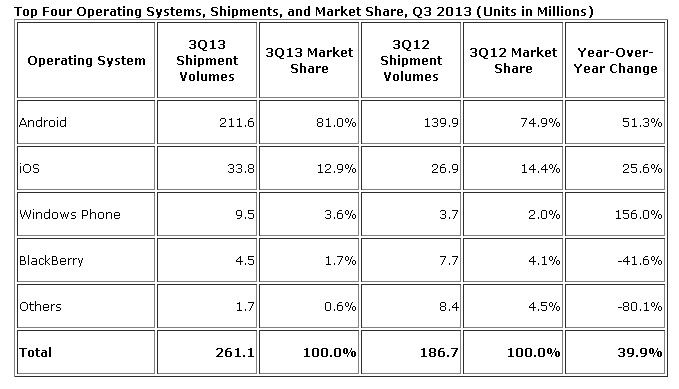 今年第三季度,Android智能機出貨量份額列第一,其中三星產(chǎn)品占39.9%,而其他Android廠(chǎng)商產(chǎn)品出貨量份額則不足1%;蘋(píng)果的iOS平臺產(chǎn)品出貨量列第二,份額為12.9%,出貨量為3380萬(wàn)部;而Windows和黑莓分類(lèi)3、4位,其市場(chǎng)份額分別為3.6%和1.7%。