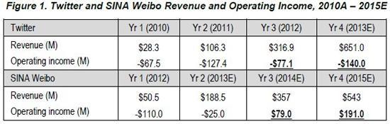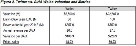 T. H. Capital報告指出,阿里巴巴第一步投資占股18%,新浪微博估值是32.6億美元,阿里巴巴會(huì )進(jìn)行第二步投資,再獲得新浪微博12%的股份,此時(shí)新浪微博的估值翻倍,達到65.1億美元。參照Twitter上市各項數據,新浪微博這一估值并不算高。