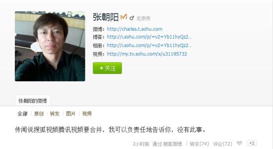 張朝陽(yáng)否認搜狐視頻與騰訊視頻合并傳聞