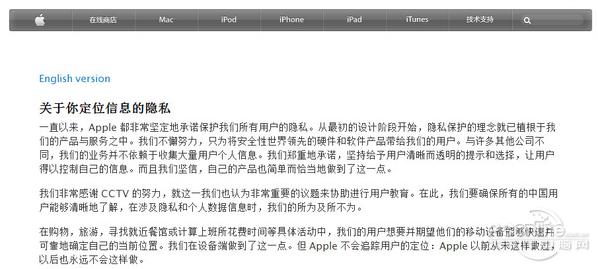 蘋(píng)果的聲明明確否認泄露用戶(hù)隱私,表明了iOS的定位功能是安全可靠的。“我們非常感謝CCTV的努力,就這一我們也認為非常重要的議題來(lái)協(xié)助進(jìn)行用戶(hù)教育。在此,我們要確保所有的中國用戶(hù)能夠清晰地了解,在涉及隱私和個(gè)人數據信息時(shí),我們的所為及所不為。”