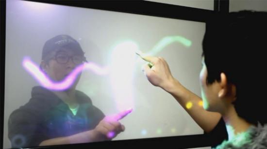 據悉,Transwall由樹(shù)脂玻璃制成,內部鑲嵌了紅外線(xiàn)觸摸傳感器,而最內層則是用來(lái)顯示圖像的全系膠片??墒荰ranswall是到底是如何工作的呢?其實(shí),Transwall在感受到壓力之后會(huì )將信息傳輸給控制中心,控制中心經(jīng)過(guò)計算向屏幕兩側的兩臺投影儀分別發(fā)出命令,將圖像投射至觸控所對應的位置。Transwall可以顯示多種顏色,觸摸交互方式也是多種多樣,可玩性非常高,相信這種雙面觸控技術(shù)在未來(lái)一定會(huì )有相當廣闊的發(fā)展前景。