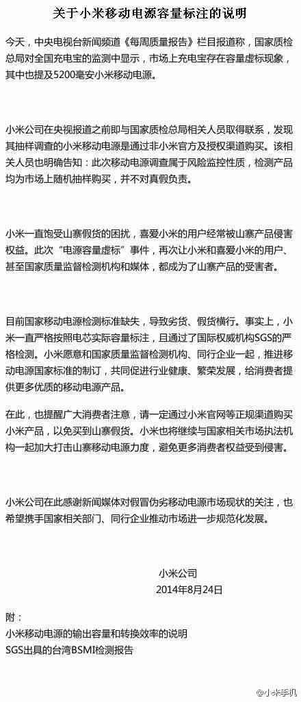 小米聲明,小米一直嚴格按照電芯實(shí)際容量標注,且通過(guò)了國際權威機構SGS的嚴格檢測,也提醒消費者,請一定通過(guò)小米官網(wǎng)等正規渠道購買(mǎi)小米產(chǎn)品。
