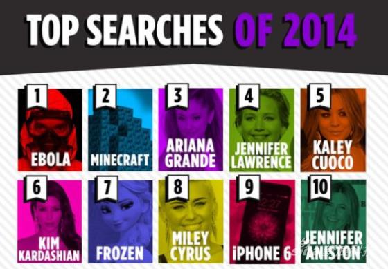 非常有意思的是,除了排名第一/二/七/九的埃博拉、Minecraft、《冰雪奇緣》與iPhone 6之外,其余均為女星。