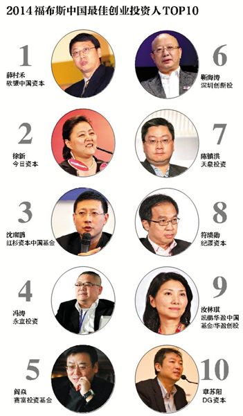 12月29日,福布斯中文版發(fā)布的2014年中國最佳創(chuàng )投人榜單顯示,軟銀中國資本執行主管合伙人薛村禾名列第一,今日資本總裁徐新列次席,之前連續多年蟬聯(lián)榜首的紅杉資本中國基金的創(chuàng )始及執行合伙人沈南鵬位居第三。
