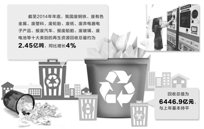 日前,商務(wù)部會(huì )同有關(guān)單位完成了《中國再生資源回收行業(yè)發(fā)展報告(2015)》,該報告顯示,截至2014年底,我國廢鋼鐵、廢有色金屬、廢塑料、廢輪胎、廢紙、廢棄電器電子產(chǎn)品、報廢汽車(chē)、報廢船舶、廢玻璃、廢電池等10大類(lèi)別的再生資源回收總量約為2.45億噸,同比增長(cháng)4%;回收總值為6446.9億元,與上年基本持平。