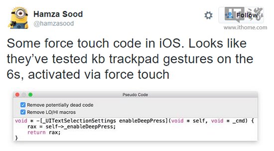 具體來(lái)說(shuō),Hamza Sood在iOS9中發(fā)現了一段代碼,可以讀取屏幕壓力并選取UI文本,然而,該代碼在他使用的iPhone6上被標記為“False”,換句話(huà)說(shuō),ForceTouch功能將出現在下一代iPhone6s、iPhone6s Plus上。
