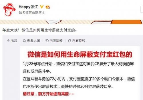 微博網(wǎng)友曝年度大戲:微信與支付寶屏蔽與反屏蔽斗爭